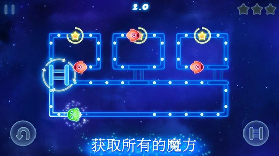 控制的绿色荧光小怪兽需要在一个个形态各异的迷宫中穿梭行进,