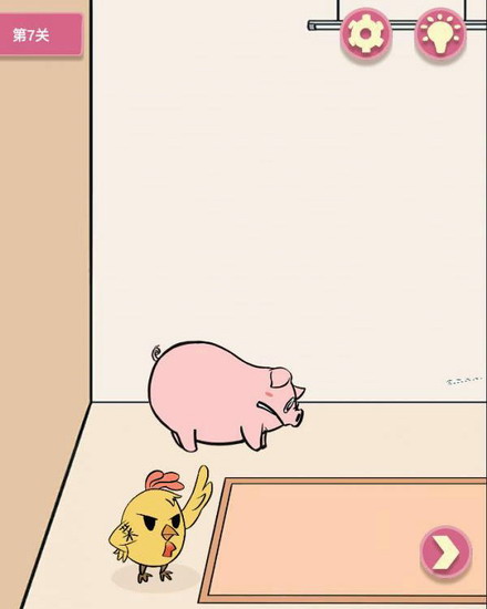 【第七关】:右边点击获得冰箱里烤鸡上的针,然后到左边点击获得猪嘴里的树枝把针给他,用树枝挠猪的鼻子,回到中间点击钥匙获得开门。