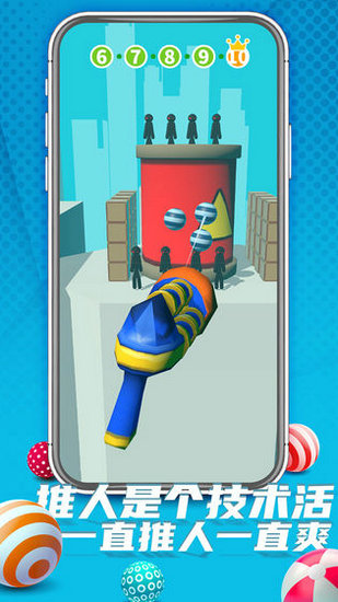《推人大作战》是一款前向看考验玩家思维、灵敏度、快速反应的休闲游戏。简洁清晰颇有立体感的卡通像素风格,动动手指,疯狂点击,聚会、下班、坐公交、坐地铁、休闲在家,随时随地来一局突破自我的快感,竭尽全力冲!闯关推人,闪电般攻击、游戏背景简洁干净,随性发挥攻击方向。