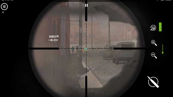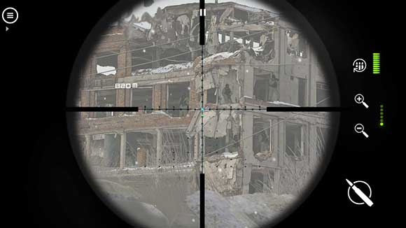 随后进入狙击手关卡,可以先仔细查看一下,但注意把握时间(从进入关卡到狙击手开第一枪之间间隔32秒),最好时开原倍镜不缩小,在狙击手开第一枪后,锁定期位置,开枪,任务完成。(狙击手放大图)