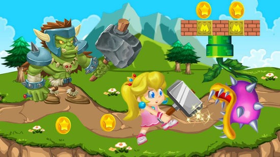 这是一款卡通风格的横版动作闯关类手游,玩法有点类似于马里奥,玩家们将扮演公主挑战不同的场景。