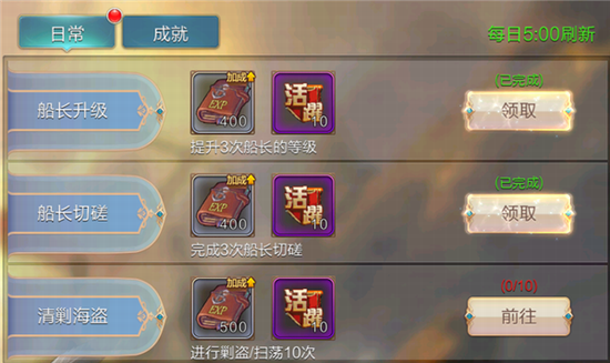 完成日常与成就也能够获得不少经验奖励。这些日常任务包括船长升级,船长切磋,清剿海盗等等。