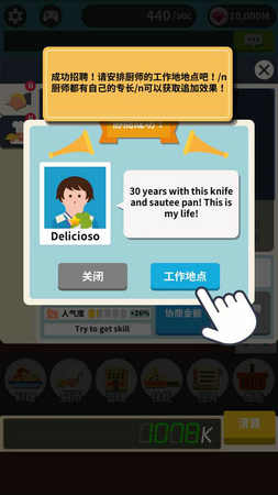 3、你需要合理利用你的现金流,来雇佣和升级你的管理员,让他们的做饭速度、搬运能力、步行速度都能有相应的提升,从而为你争取更多的收益,升级和扩张你的餐厅。