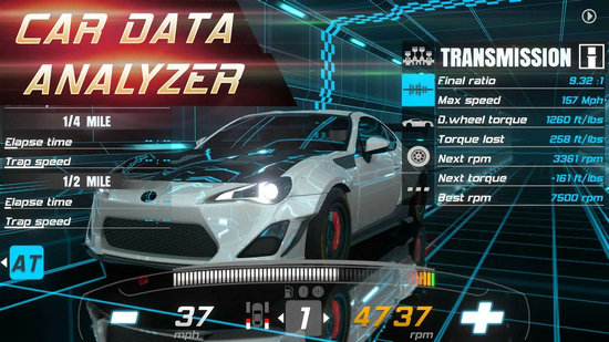 1、玩家只需要按住前行的箭头就会不断加速,每一个车辆的侧重点不同,加速的结果也自然不一样。
