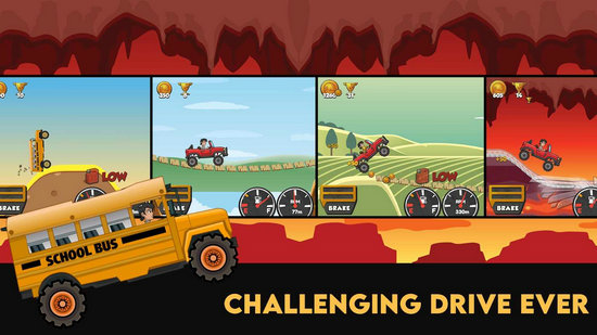 3、面对危险的爬坡赛车环境,要解锁许多不同的车辆。收集硬币以升级新车辆并覆盖远距离。