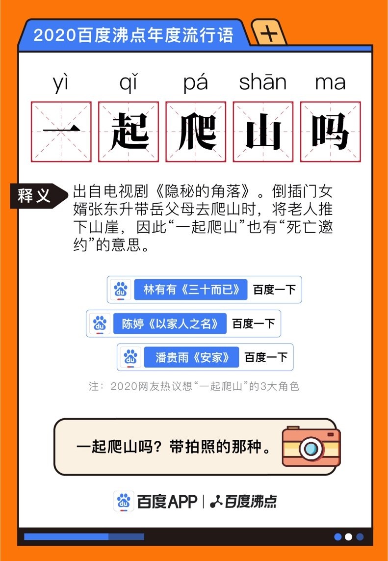 2020 百度沸点完整榜单也将于近期发布。除了年度流行语,今年的百度沸点还有年度关键词、年度国民骄傲、年度事件、年度泪点、年度生活方式、年度骄傲人物、年度热议人物、年度电视剧、年度综艺、年度小说、年度电影、年度知识热词、年度科技热词等数十个榜单,全面复盘 2020 年度记忆。