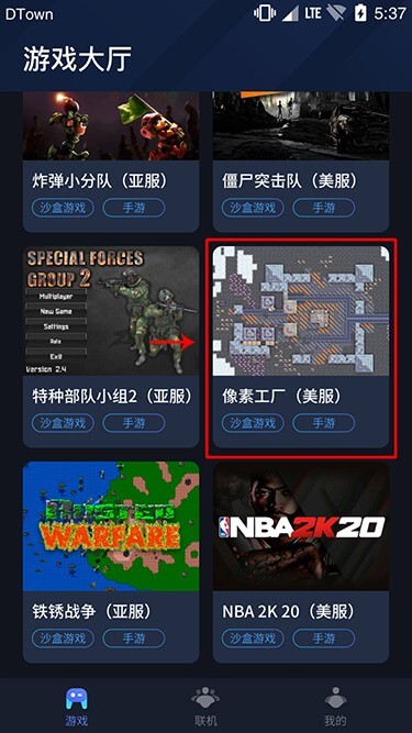 3、进入APP后点击【游戏】页面,进入游戏大厅,可选择游戏【像素工厂】并点击进入;