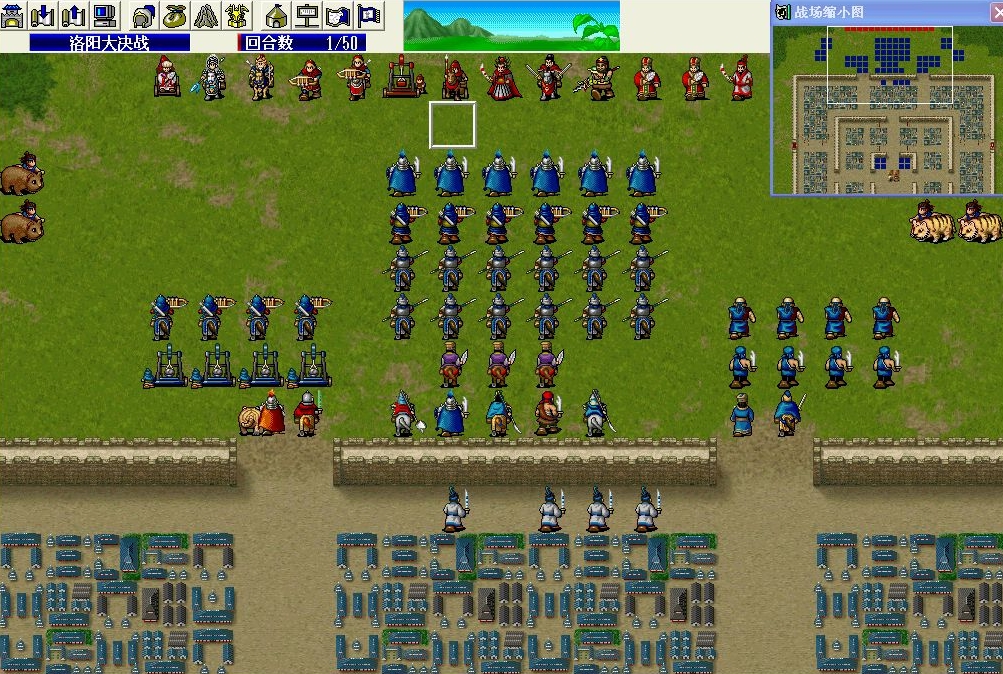 然后两个城门边的敌军会出城来攻.先在左下角留55的空吧,摆成一个阵势.能抗的在前,文官在后。