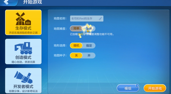 1、首先,在进入游戏后点击开始游戏,在开始游戏界面点击下方的【模组】按钮。