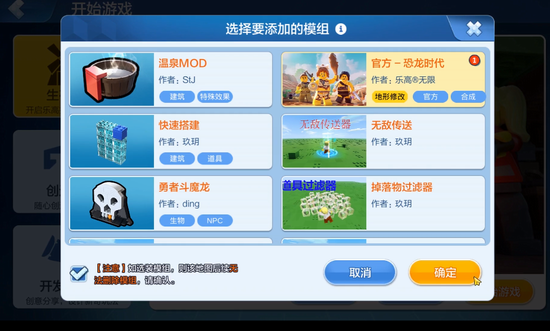 2、在模组界面中可以看到【官方-恐龙时代】的模组选项,点击并勾选左下角的选项后,点击右下角的确认按钮就可以开始游戏了,进入游戏后就是侏罗纪的地图。