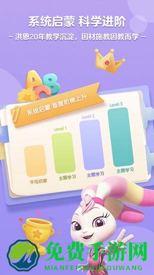 《洪恩ABC》是专注儿童英语启蒙的教育品牌,遵循儿童认知发展规律和二语习得理论,设计出了科学分级体系及培养目标,通过外教动画、有声互动绘本、韵律儿歌、互动游戏等形式,让孩子在3D场景中高频互动,主动开口,轻松高效学口语。