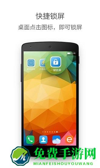 一键锁屏,快捷锁屏,安全贴心。手机桌面上,点击“一键锁屏”图标,即可快速锁屏,减少手机电源键使用,延长其使用寿命。软件小,绿色纯净无广告,是您装机必备的实用软件。由于部分手机厂商的定制,如出现卸载不了的情况,请到“设置安全设备管理器”中去掉激活,再卸载就可以了。