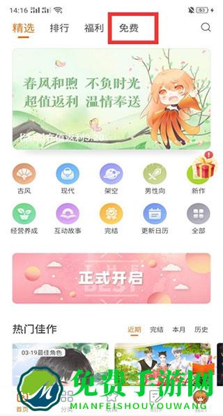 1、在免费手游下载橙光游戏最新版本,完成后打开软件,点击上方的免费;