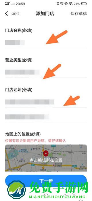 2、在窗口中填写店铺的名称、营业类型、地址,如图所示;