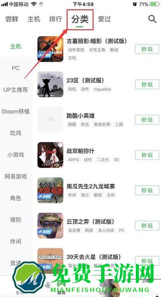 2、选择上方标注位置的分类,进入游戏分类专区;