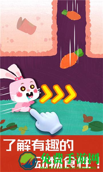 小兔子可喜欢吃胡萝卜啦。胡萝卜从洞口掉进来,小兔快跑,接住胡萝卜。有蛇出没,小兔要躲起来哦!鼹鼠肚子好饿呀,想吃美味的蚯蚓,宝宝帮它抓蚯蚓喽。