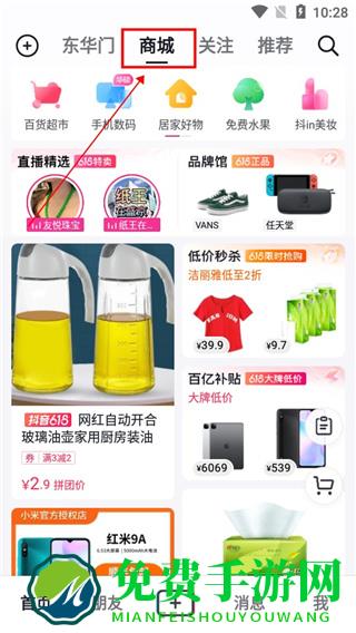 1、下载抖音短视频app,点击商城进入抖音商城界面;