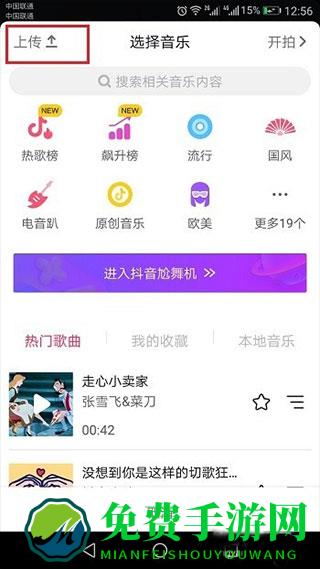 2、第二步进去选择音乐界面之后,点击左上方的“上传”;