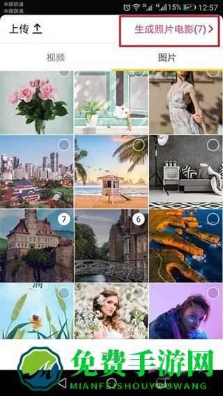 4、第四步选择要生成视频的图片,点击右上方的“生成照片电影”,需要注意的是选择照片要大于1张