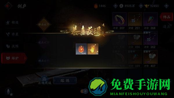 玩家可在“剑庐“界面获取、强化和回收装备。