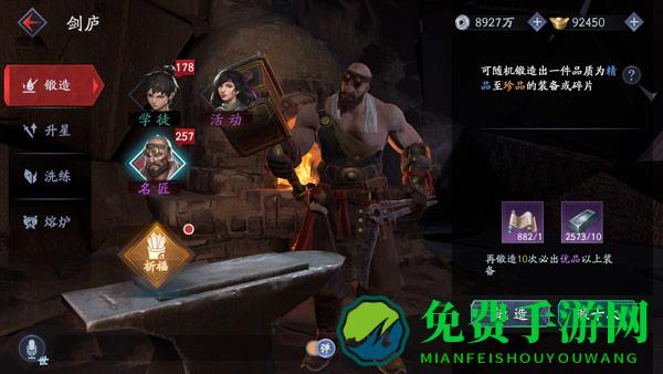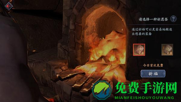 玩家通过消耗锻造材料来获取装备。锻造可选择“学徒锻造“和“名匠锻造”,名匠锻造出精品至珍品的装备或碎片的概率高于学徒。锻造前,每天玩家可以免费祈福一次,通过消耗三种不同的祈愿签,获取锻造装备的优势状态加成。