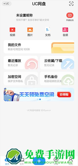 1、在UC网盘中,点击下方的【天天领免费空间】活动进入;