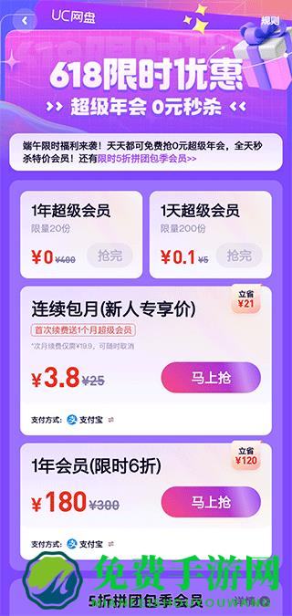 3、大家还可以选择以低于正常会员价格的福利开通UC网盘会员,领取免费的空间。