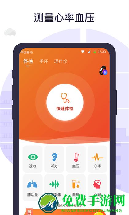 1. 通过手机测量用户的血压、心率、视力、听力、肺活量、心理指数、色盲等身体数据。