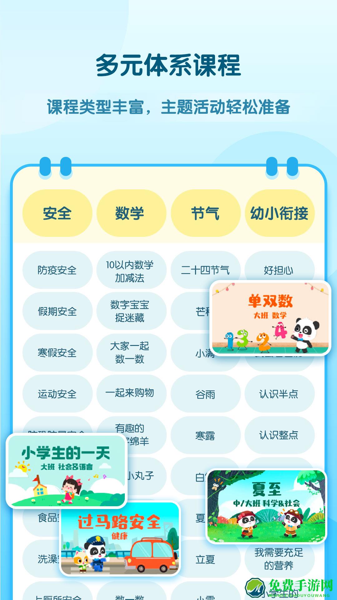 3、涵盖幼儿园高频活动主题,同时提供安全教育、24节气、幼小衔接等特色体系课程。