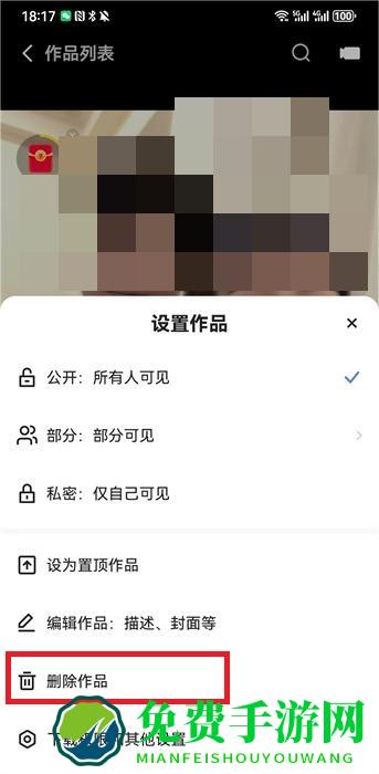 4、弹出的功能界面点击【删除作品】,去进行删除;