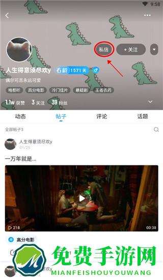 5、若要给对方发私信,可以点击对方,进入对方主页后,点击“私信”即可。