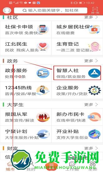 1.进入软件后,在下方菜单栏中找到“城市”-“政务”-“智慧人社”