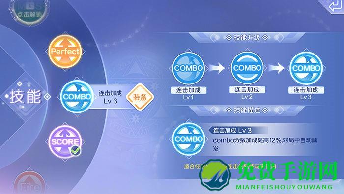 提高歌曲音符COMBO得分,比较适合可以达成歌曲ALL COMBO评价的玩家选择,这个技能最忌讳连续出现MISS,这样会损失很多的得分加成。在对当面模式比较熟悉,并且对歌曲旋律、音符熟悉的情况下,这个技能会比较实用。
