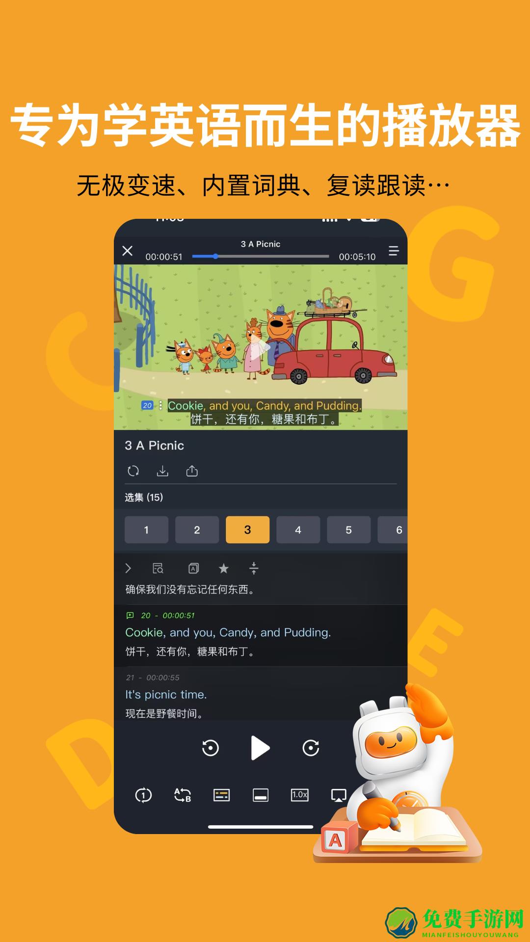 3、英语启蒙:专为英语而生的播放器,无级变速、内置词典、复读跟读等;