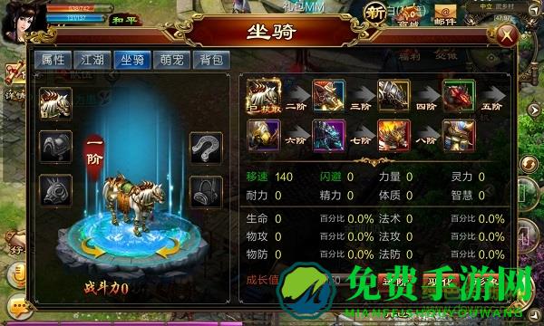 新征战的坐骑免费获取,可不断进阶,可通过坐骑形象系统改变坐骑形象,坐骑装备可副本获取。