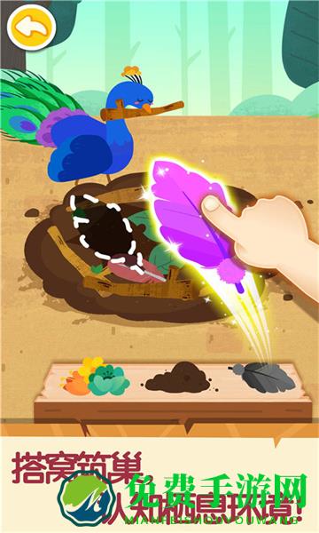 孔雀公主想住在林间草地,宝宝帮它打造舒适的家吧!先收集树枝、羽毛,用树枝拼搭出圆形的窝,接着铺满羽毛。孔雀公主的新家完成!