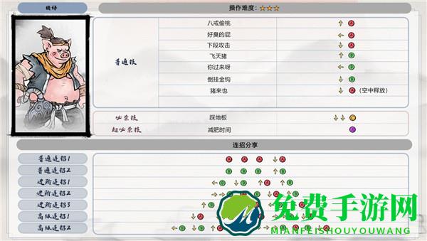 3、猪仔基础连招,操作难度三星:↓A↓↓C→→A→→B接↓A再接R超必杀技减肥时间。