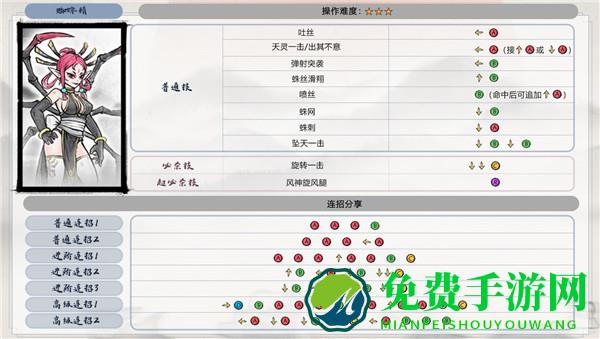 4、蜘蛛精基础连招,操作难度三星:←A↓A↓B↓↓C←A接BBB再接R超必杀技风神旋风腿。