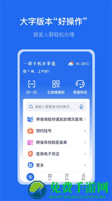 是云南省人民政府为企业和群众提供政务服务的移动端应用,办事人通过身份验证登陆后,即可一站式办理公安、住建、司法、税务、医保、人社、民政等多个部门的多项业务。