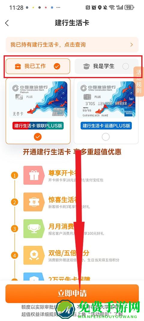 3、之后选择“已工作”或者“学生”,再点击下方的立即申请。