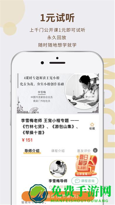 墨池学院app是提供书法培训的教育软件。提供了专业的书法线上教学服务,学员们可以选择感兴趣的课程报名学习,和书法大师面对面交流,让你最短期内就能够掌握书法书写技巧,练成一手好字!