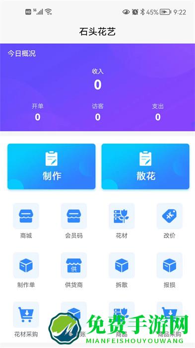 总览商城、会员码、制作单、改价、花材、商品、商品采购单、报损单、员工等功能。