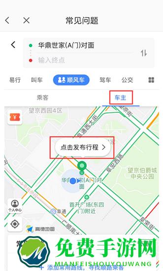 3、点击后在上方会出现一个界面,找到如图所示的【顺风车】并点击,接着点击下方的【车主】,再点击地图中的【点击发布行程】。