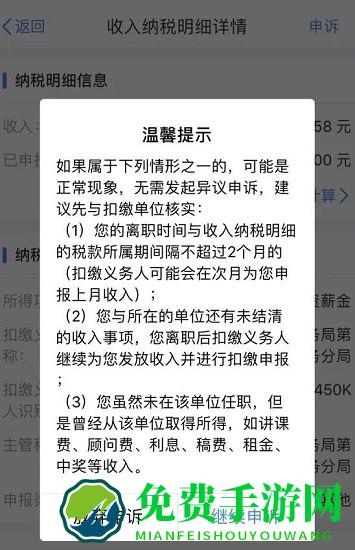 点击进入某一条收入明细还可以查看详细信息。若您发现某笔收入属于身份信息被冒用、本人确实没有取得的情况,您可以点击该笔收入,再点击右上角“申诉”。特别提醒:若属于“温馨提示”情形之一,建议先与扣缴单位核实,不需要发起异议申诉。