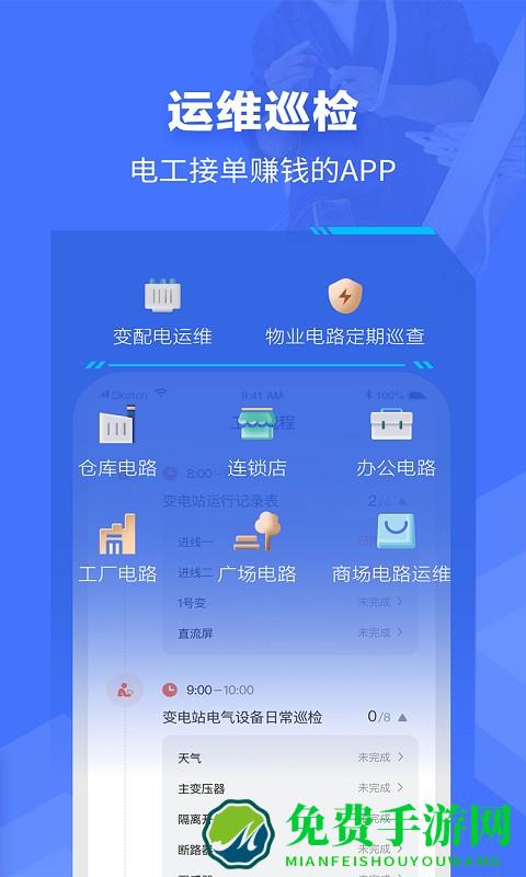 e电工,一款电工为自己创富赚钱的应用!e电工,一只手机,一支电笔,家门口巡检,轻松创富;运用移动互联网技术,帮助电工对客户变电站进行集中监测和异常预警、报警管理,就近为客户提供变电站运行服务。
