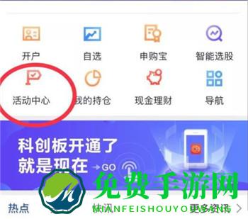 在登录页“我的”菜单,可快速进入活动中心、客户服务以及业务办理(如风险测评和开通科创板、港股通)