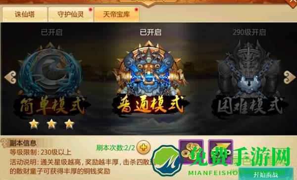 天帝宝库是游戏中提供金币来源的单人副本玩法,有三种难度,难度越高,奖励金币越多。