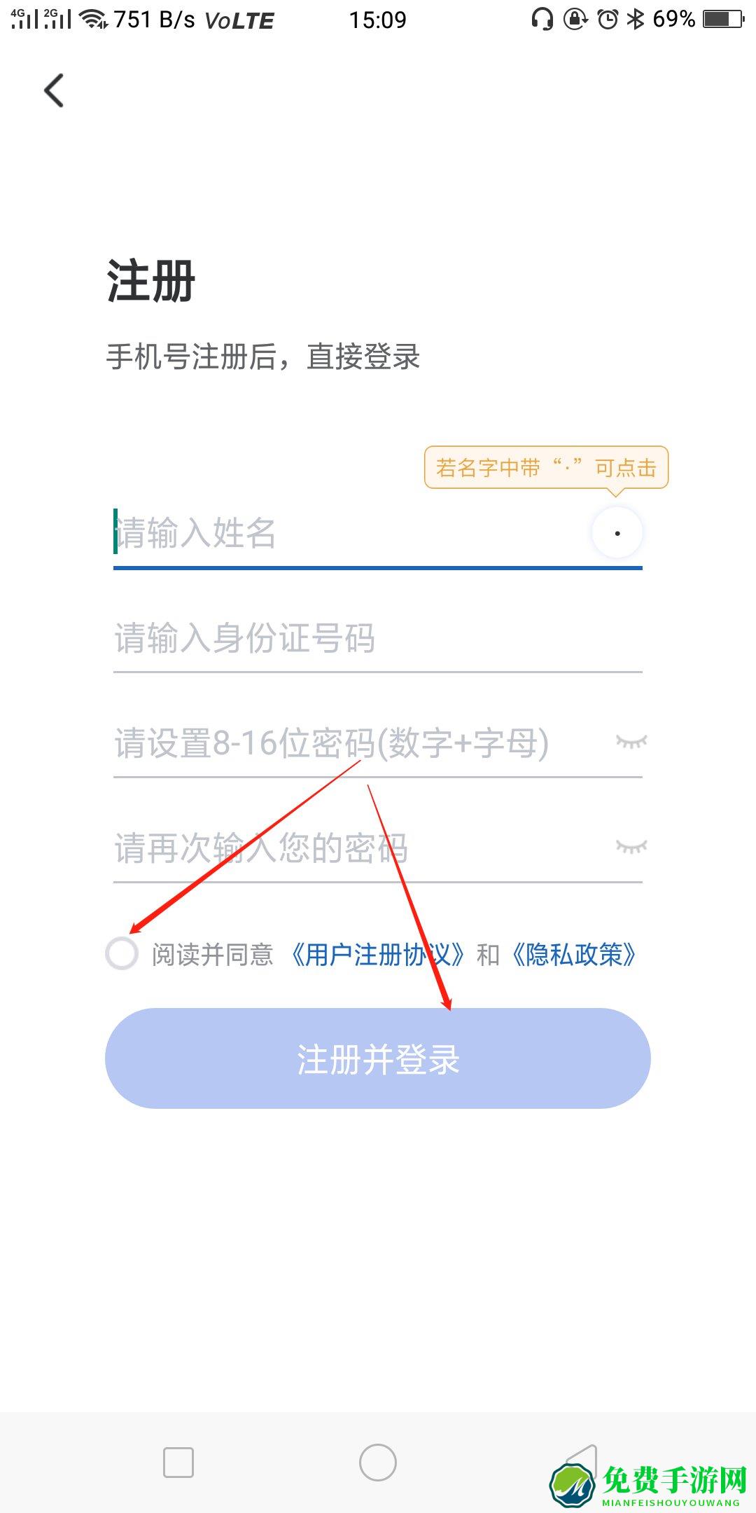 3.按照提示输入姓名、身份证号码、密码等信息;阅读并勾选相关协议;点击“注册并登录”;