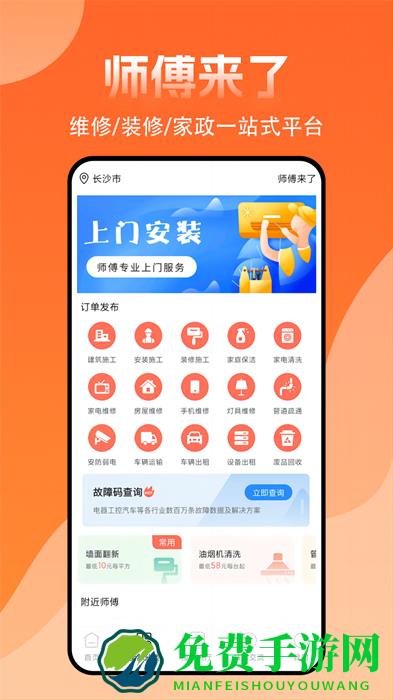 师傅来了app是一款提供上门维修服务的手机应用。面向用户提供了丰富的维修服务项目,如:家电维修、净水器维修等等。用户可以通过手机在线下单预约师傅上门服务。服务非常贴心、到位!欢迎网友们来免费手游网下载使用。