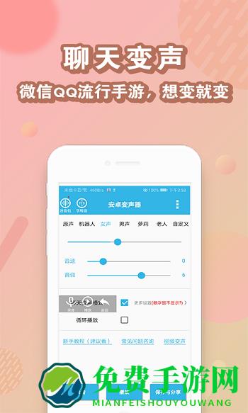 安卓变声器是专门为安卓用户打造的一款手机变声软件,通过这款软件可以随心所欲的变成自己想要变的声音,使用与营销、恶搞等等场合,非常的有趣好玩!喜欢的朋友可以到免费手游网下载体验哦!